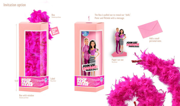 Invitation and promotion materials for Attack Theatre’s Rock Paper Sizzle Event. I am particularly pleased with the invitation, all hand cut and assembled, the recipient pulls the boa from the top of the box which reveals the two artistic directors with a message to join in the fun.