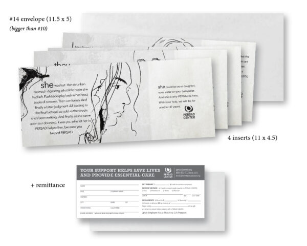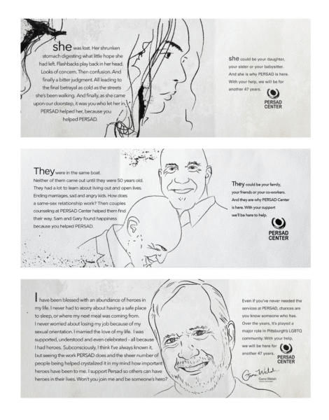 Utilizes a rough organic illustration style. Stories are fictional except board member comments. The stories are intended to be vague, but clearly set up there is a need and PERSAD is there to help.