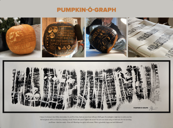An internal agency pumpkin carving contest. I was happy to take first place. I wrote it with Vincent Price’s voice in mind and used a Dremel to carve it in a mirror image for printing.